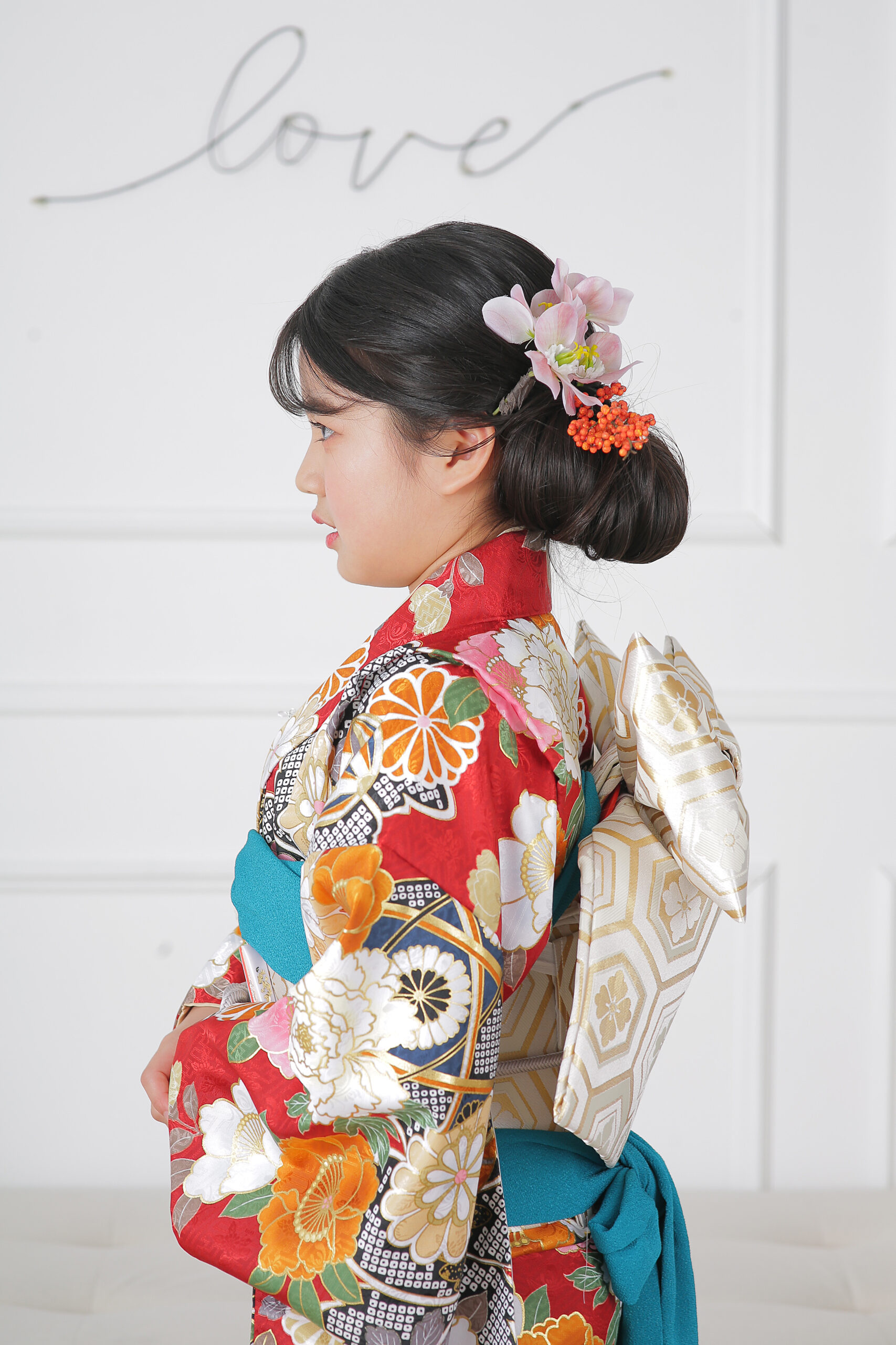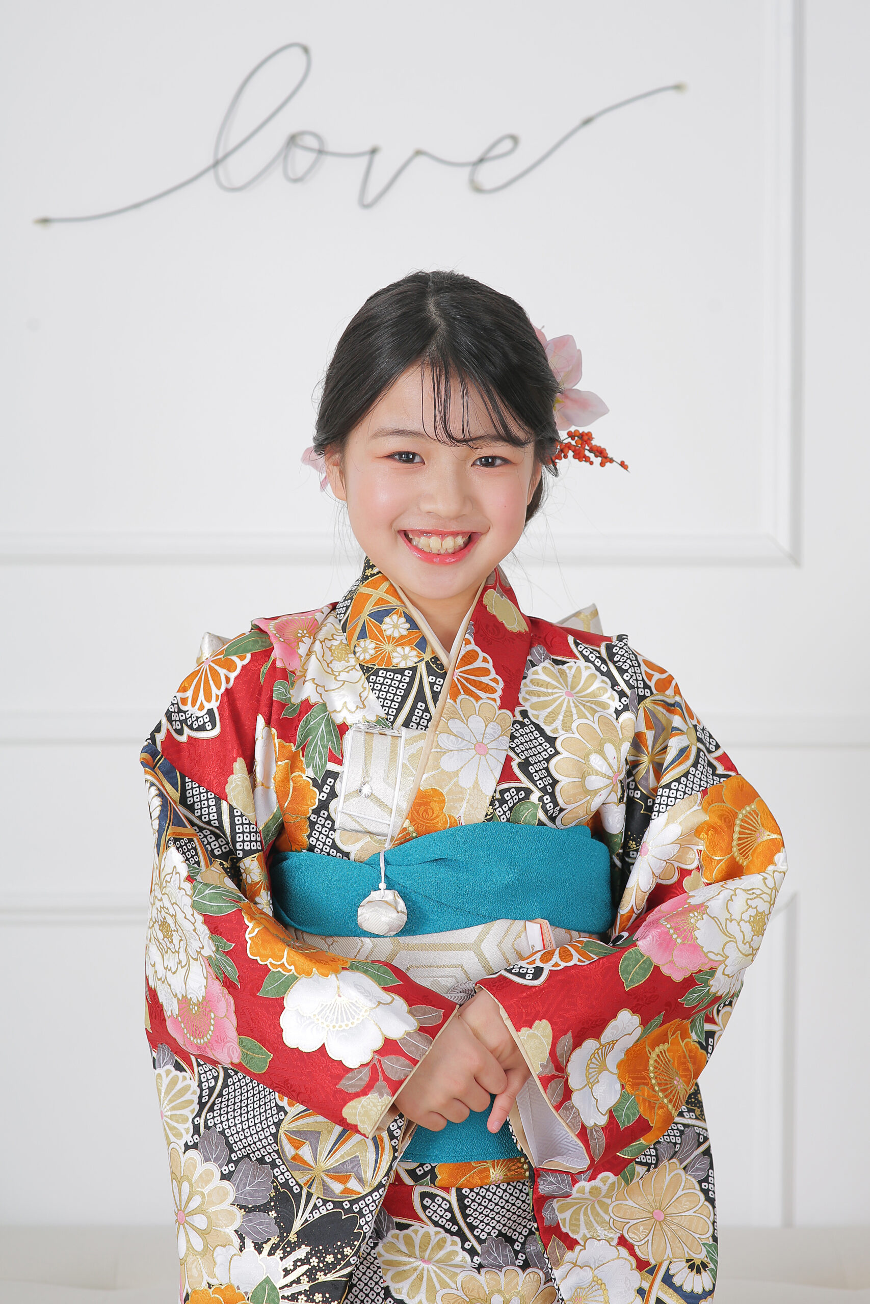 赤のお着物に大柄のデザインが入った