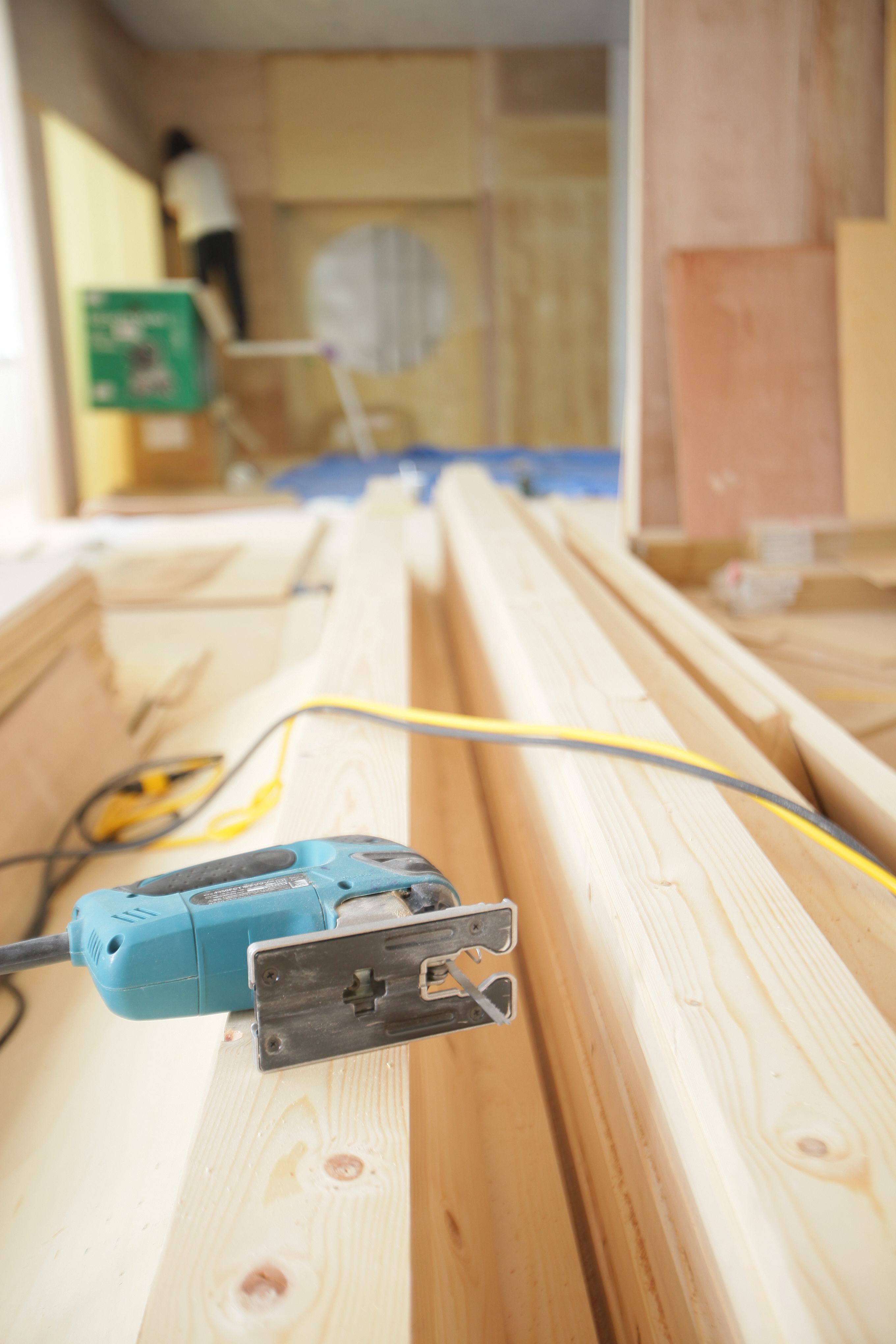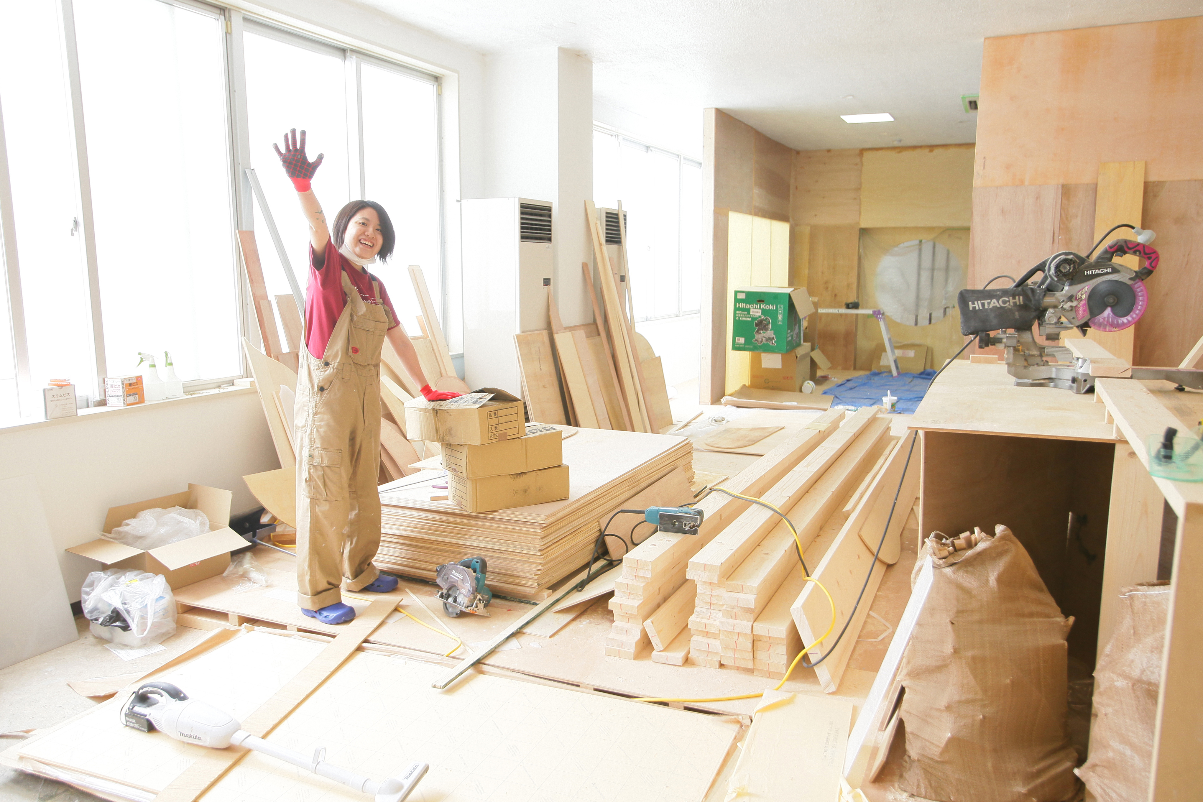 大量の木材と工具も見えますね!日頃はカメラを握っているスタッフたちも、作業着に着替えて頑張っているようです♪
