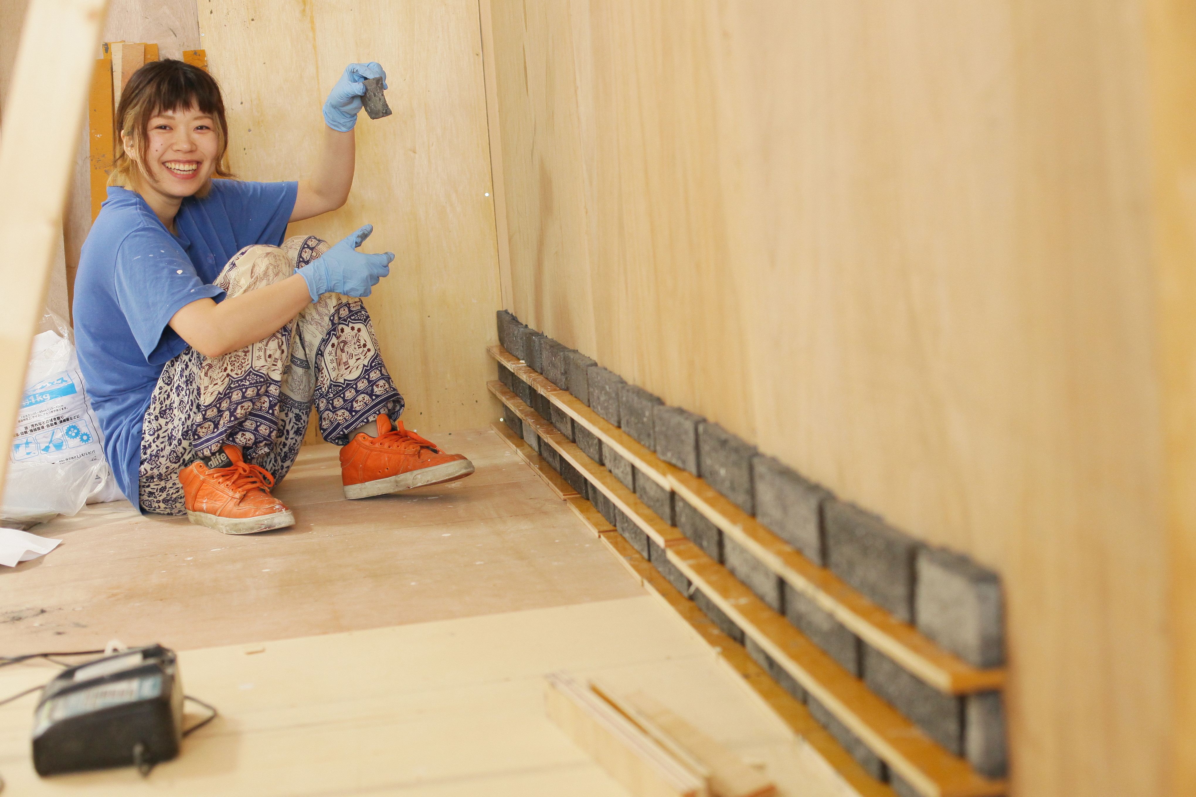 「ゆきちゃーん、なにしてるのー?」\ 壁にレンガを貼ってるんですよー! 見た目によらず結構難しいでーす! /