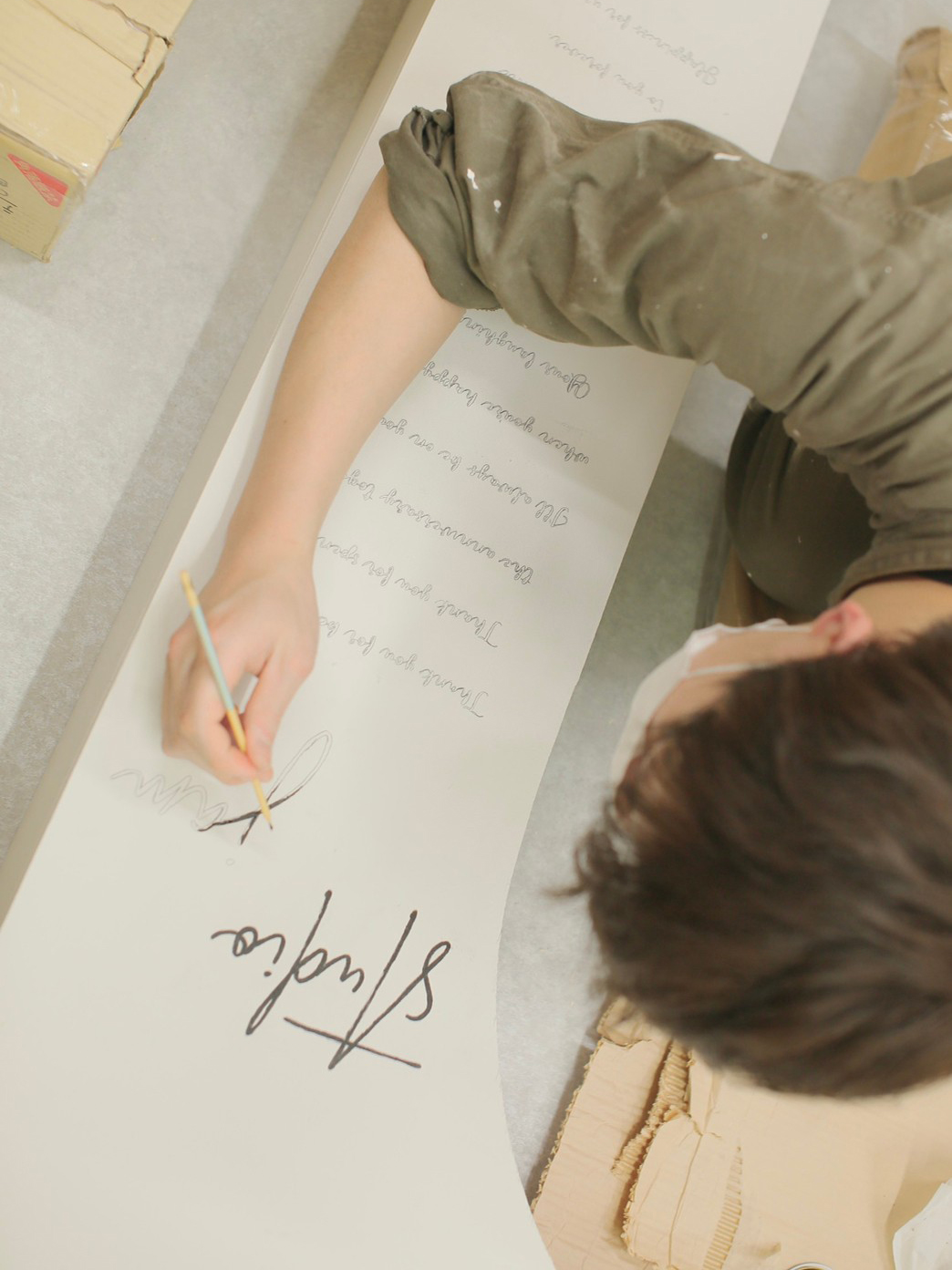 漆喰に塗り替えられた壁や『STUDIOJAM』のロゴが入った透明アクリルの札、手書きの筆記体など